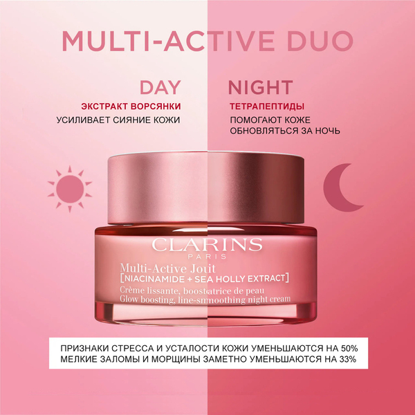 Ночной крем для лица Multi-Active Night Face Cream. Ночь — идеальное время, чтобы восстановить кожу. Теперь Clarins предлагает вам сделать это вместе с ночным кремом Clarins Multi-Active Nuit, который состоит не менее чем из 92% ингредиентов природного происхождения. [Skin Charger Complex]: ниацинамид в сочетании с экстрактом морского падуба образуют мощный дуэт, который помогает уменьшить первые видимые признаки старения. Укрепляется барьерная функция кожи, возвращается ее сияние и сохраняется молодость. Мощный тетрапептид помогает коже обновляться в течение ночи. Результат: после пробуждения кожа выглядит отдохнувшей, более гладкой, увлажненной и сияющей.